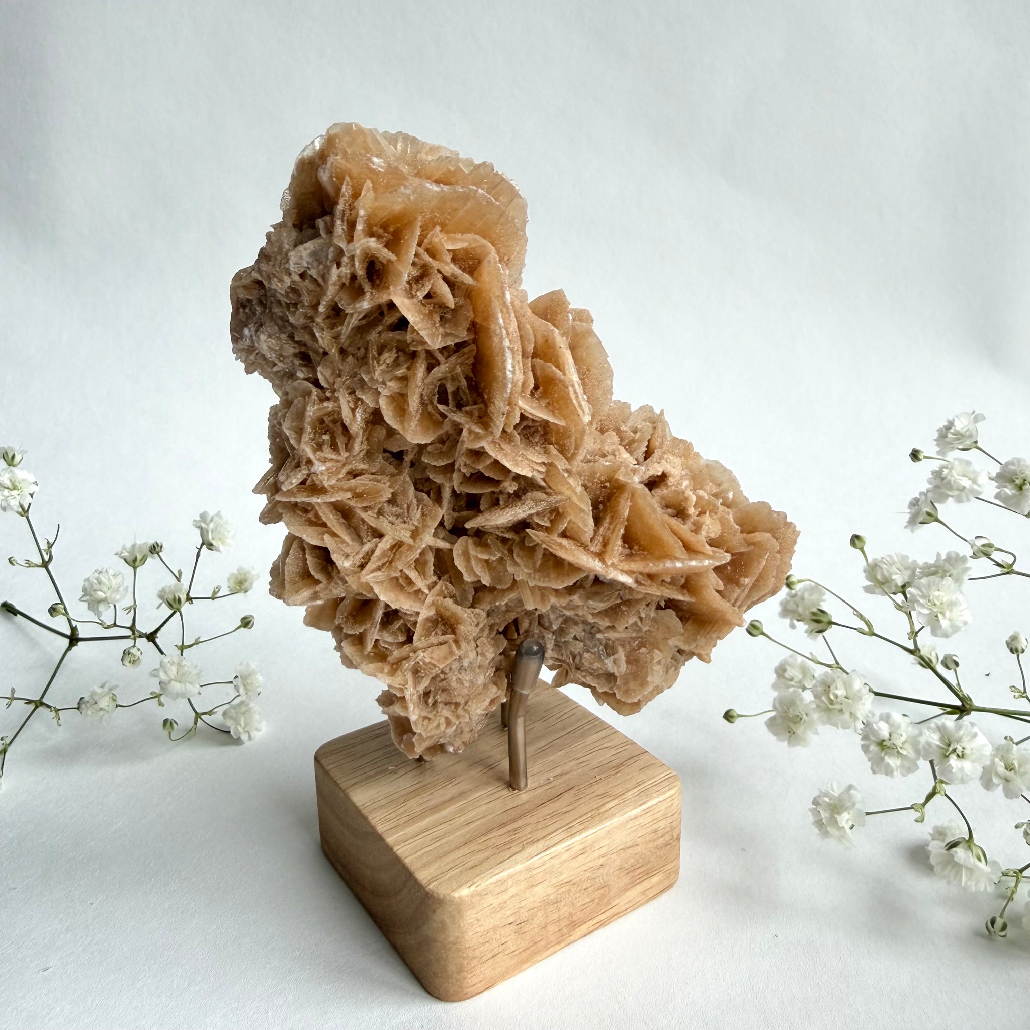 Beautiful specimen of desert rose from Tunisia. Desert rose is a unique crystal formation made of gypsum or barite, shaped by wind, sand, and water over thousands of years. This delicate, rose-like cluster is rarely found in desert regions, forming when mineral-rich water evaporates, leaving behind layered crystal structures.