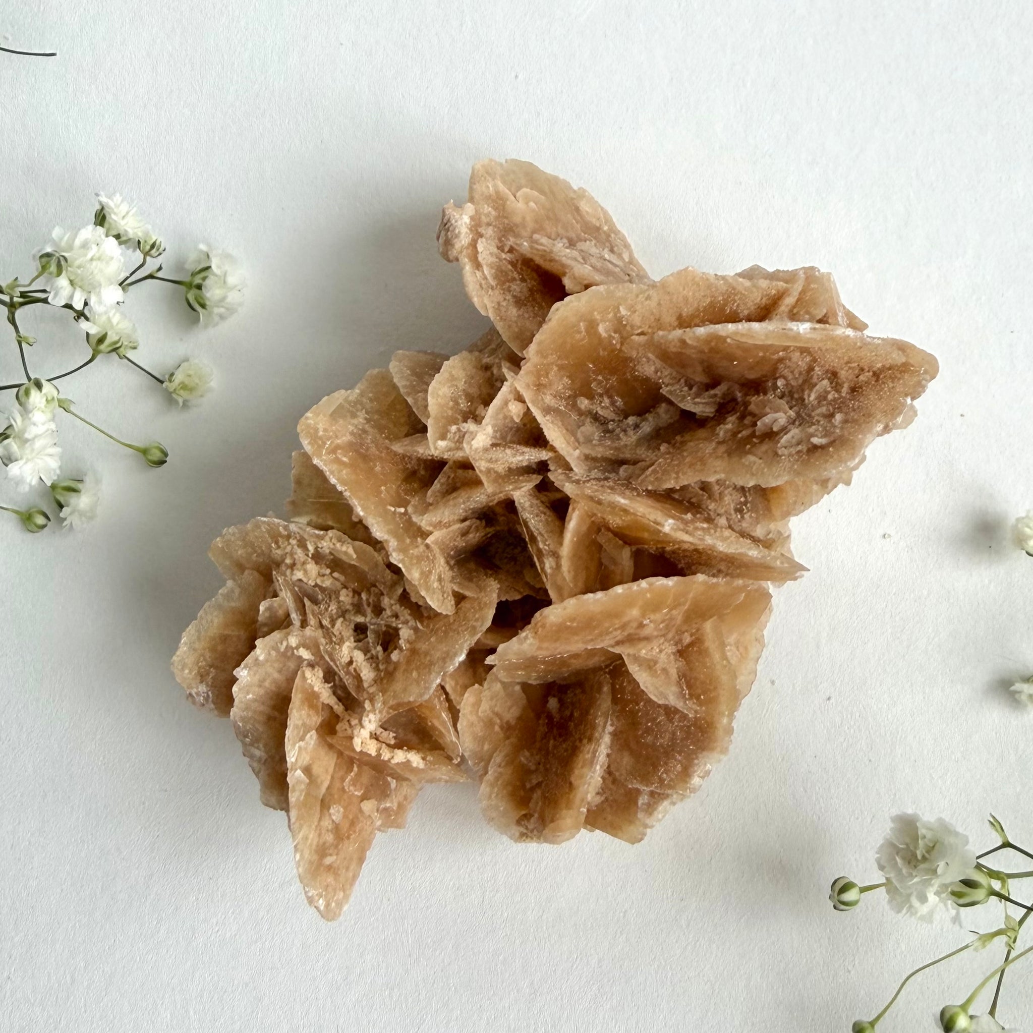 Beautiful specimen of desert rose from Tunisia. Desert rose is a unique crystal formation made of gypsum or barite, shaped by wind, sand, and water over thousands of years. This delicate, rose-like cluster is rarely found in desert regions, forming when mineral-rich water evaporates, leaving behind layered crystal structures.